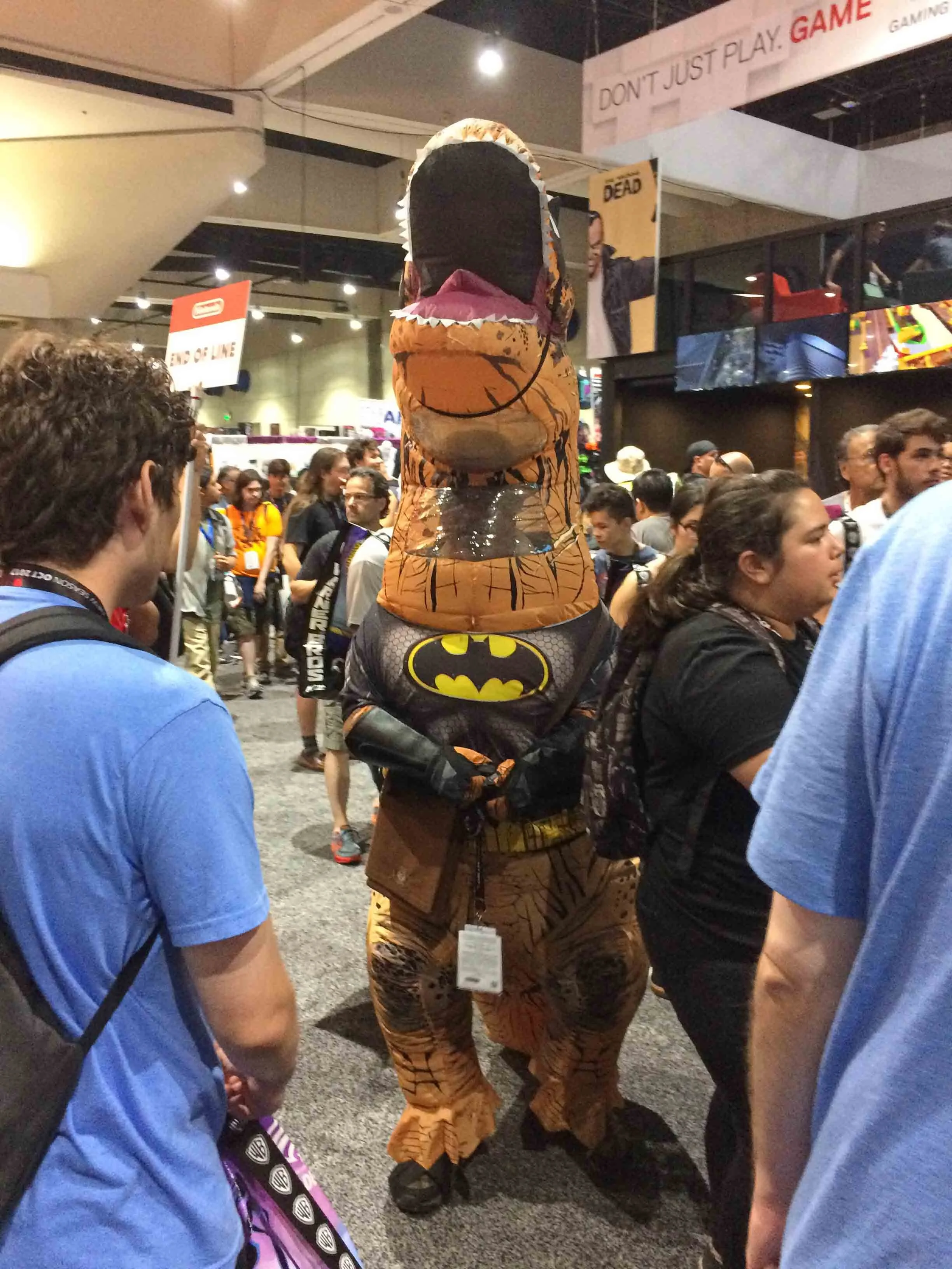 An inflatable T-Rex dressed as Batman in the Exhibit Hall.