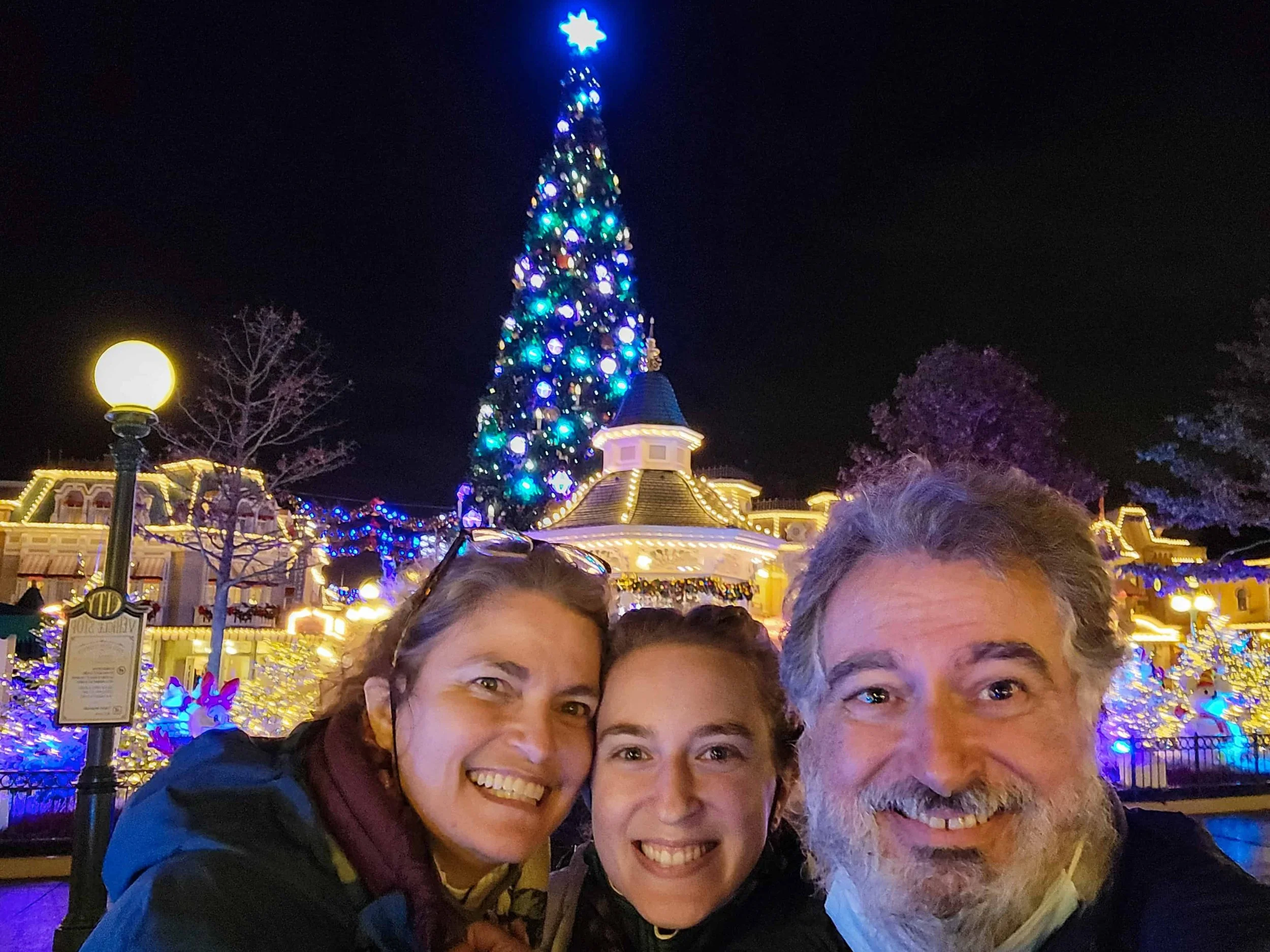 Adult selfie in front of the Disneyland Paris Christmas tree.