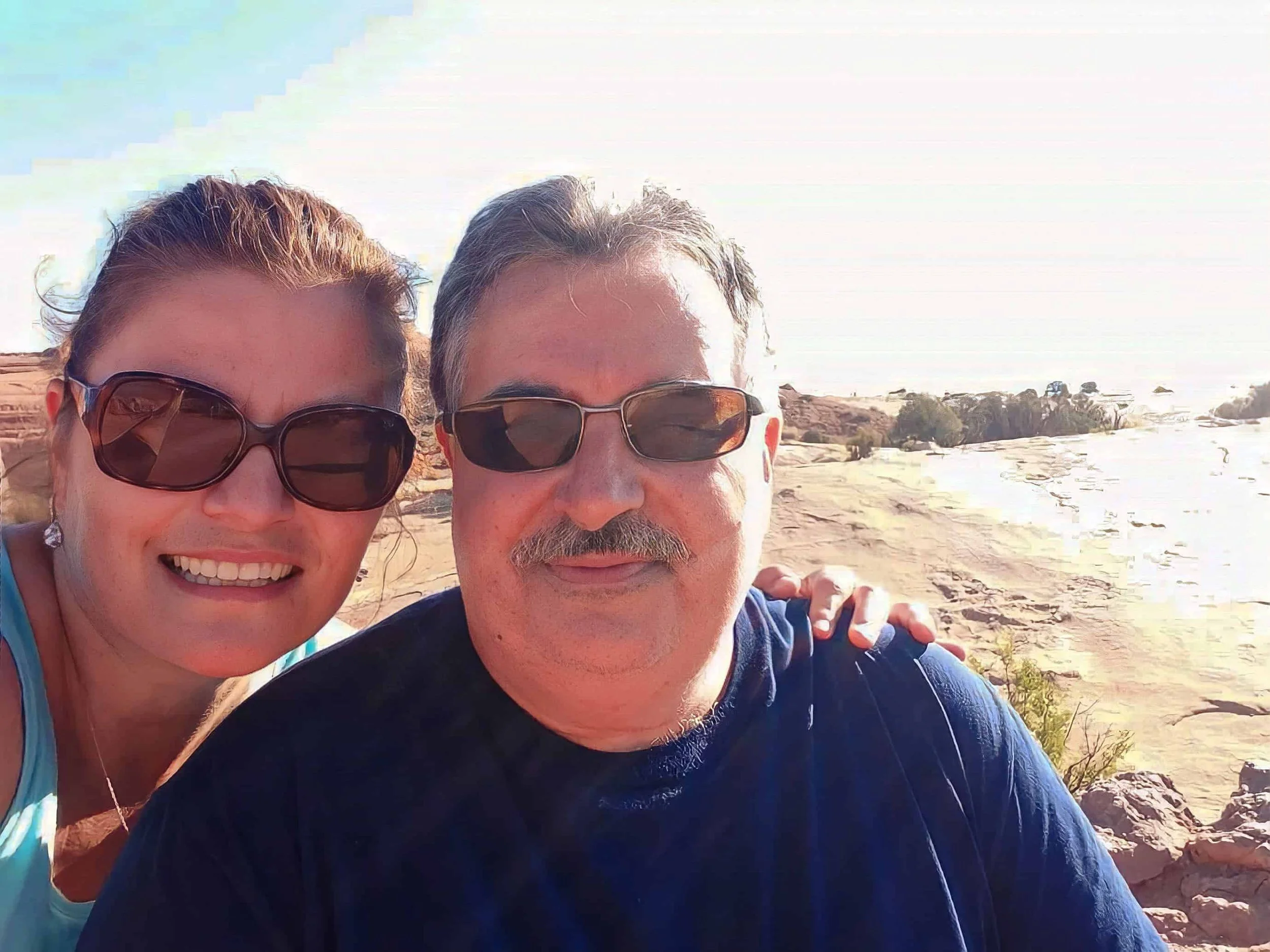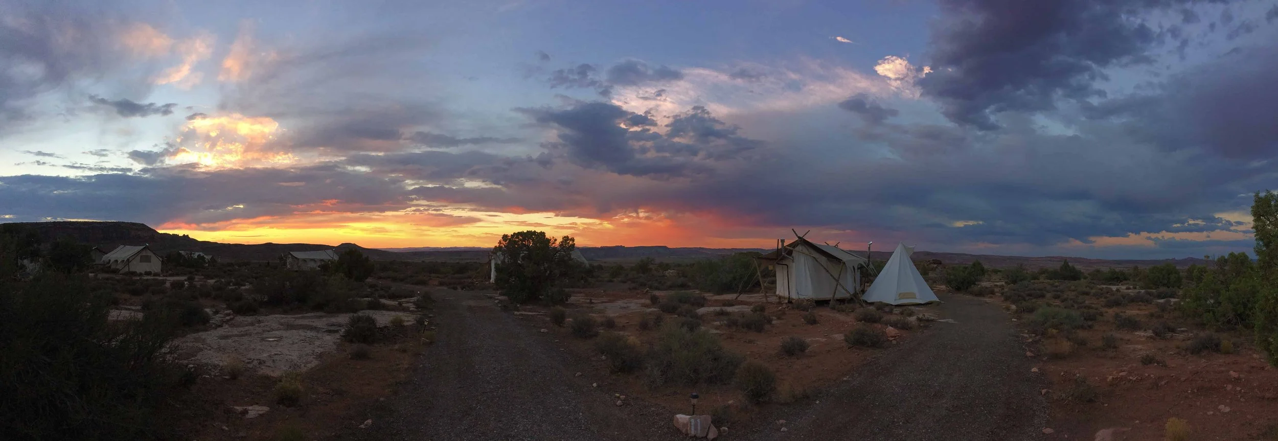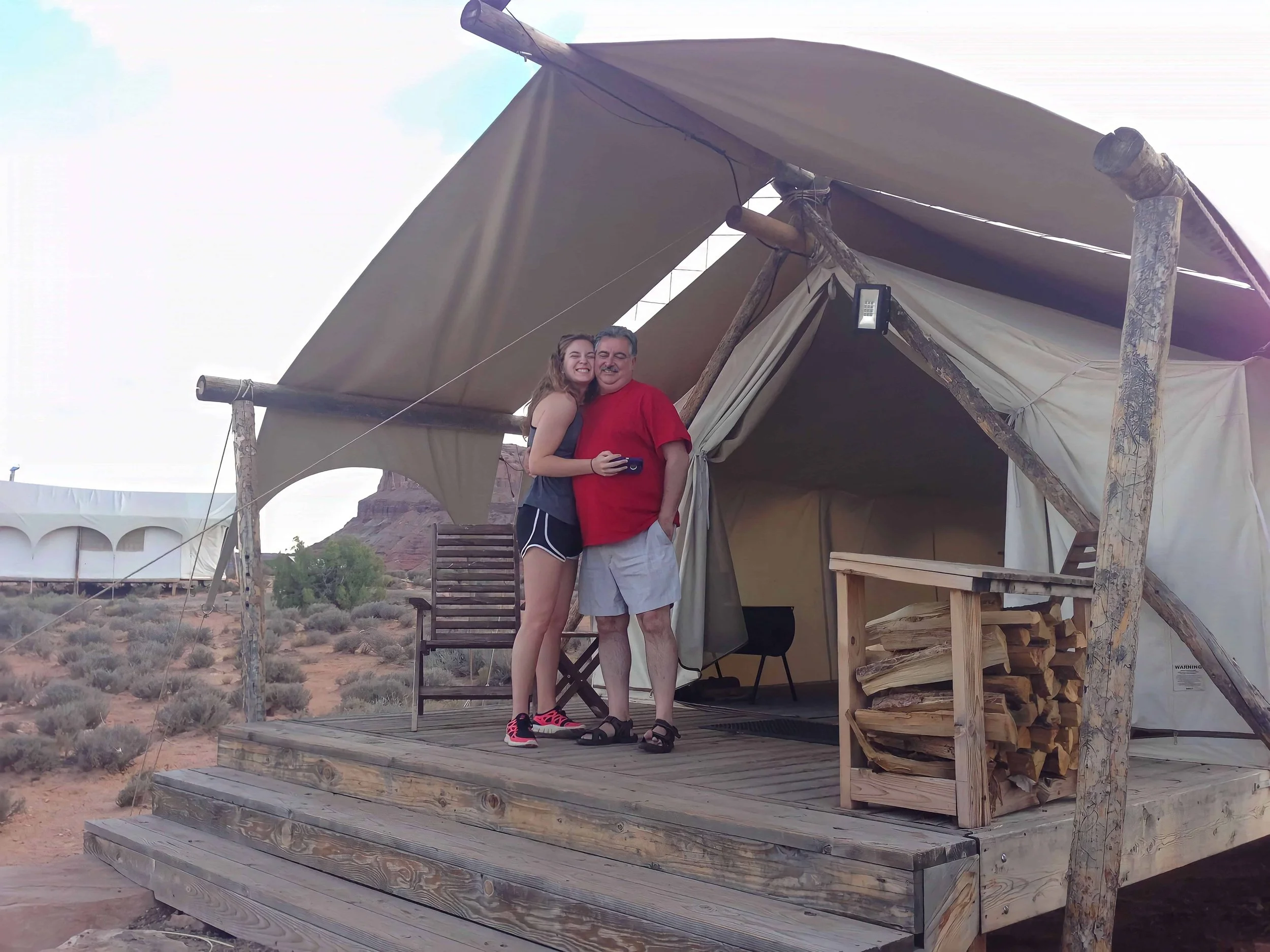 Ellie & Kevin standing in front of our luxury glamping quarters at Under Canvas in Moab, UT